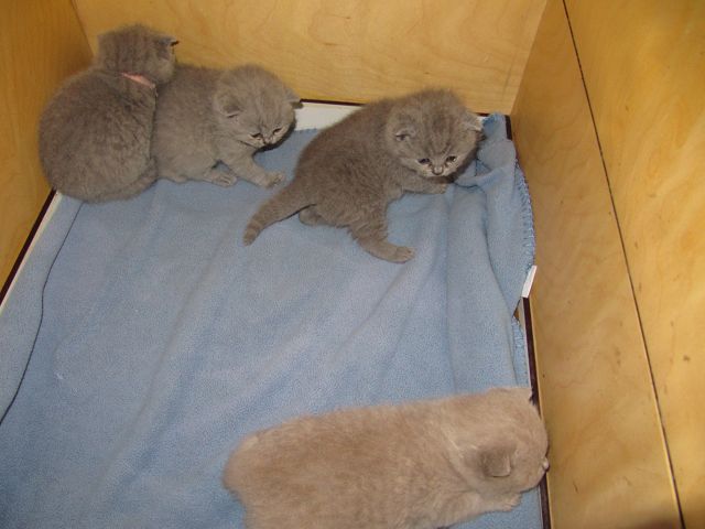 Die Kitten heben jetzt auch das Köpfchen, sie probieren auch schon das sitzen. Ihre Fortbeweglichkeit besteht hauptsächlich aus robben. Fauchen und fiepen funktioniert ganz gut. Ihre Milchzähnchen sind durchgebrochen.